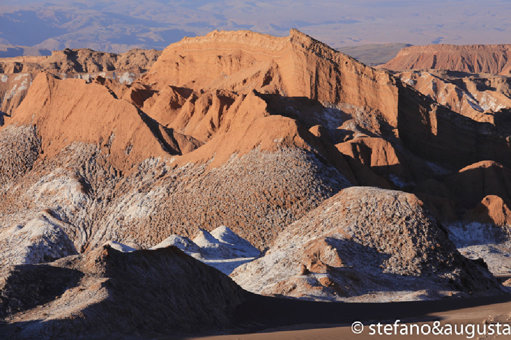 E poi il confine col Cile: si lasciano i Toyota Land Cruiser maestosi e infaticabili, si lasciano coperti di polvere e si sale su un elegante SUV della Nissan tirato a lucido, e si capisce subito che siamo in un altro mondo: l’autista ci guarda come se fossimo dei pezzenti provenienti dalla preistoria, certo siamo un po’ sporchi, sudati, impolverati e poco lavati (ma con quale acqua?!) e lui al confronto è un damerino e forse ha paura che gli sporchiamo i sedili e i tappetini! Si scende a rotta di collo perdendo 2000 metri di dislivello in mezzora, su una strada incredibilmente dritta senza neanche una curva per attenuare la pendenza e la velocità, e si entra a San Pedro de Atacama; si torna indietro nel tempo, sembra di essere in una comunità hippie degli anni ‘60, una discreta ma evidente atmosfera rilassata con sottofondo di spinelli, birre, musica reggae, divertimento, relax e suggestioni a cavallo fra la psichedelia di “Zabriskie point” e la west coast acida dei Greateful Dead. La vita per i giovani turisti nordamericani inizia pigramente a mezzogiorno, ma per chi non vuole perdersi le emozioni vere la sveglia è di notte, per andare a vedere i geyser del Tatyo a 4200 metri, avvolti da coperte di lana gettate sopra i piumini, con la folle tentazione di avvicinarsi ai getti di vapore per scaldarci un po’, chi crede che l’ inferno sia caldo non è mai passato da lassù… e poi ancora vertiginosamente giù nel deserto di Atacama, la Valle della Luna con dune di sabbia in continuo movimento modellate dal vento, e poi ancora le lagune salate con i fenicotteri che volano davanti alle montagne, irraggiungibili nel loro anelito per la libertà.