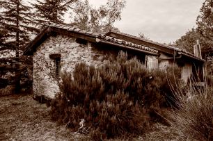 Il capanno è situato a metà costa, su un piccolo pianoro, ed è diviso in tre parti. Nella prima, corrispondente al cascinotto preesistente, sono stati ricavati una cucina e un piccolissimo bagno con doccia. La parte nuova (una cinquantina di metri quadrati circa) è suddivisa equamente in una sala-refettorio-biblioteca (quattro grandi scaffalature accolgono i libri doppi e tripli, ma anche i 43 splendidi volumi di una Treccani intonsa della quale ho liberato un amico) e in un ripostiglio per attrezzi. Quest’anno, proprio recentemente, ho aggiunto una tettoia che darà ricovero al vecchio Pasquali. Dalla finestra della cucina si vedono le Alpi Cozie, è centrata proprio sul Monviso, dal bagno il Tobbio, dal lato settentrionale la Valle del Fabbro. Sarebbe più esatto dire si vedevano, perché le piante messe a dimora venticinque anni fa (roveri, due cedri, una betulla) sono cresciute al punto da escludere quasi da ogni lato la vista. Ma l’aspetto più importante è l’isolamento: per trovarlo occorre andarci apposta, e sapere con precisione dov’è. Di questi tempi la cosa costituisce una garanzia.