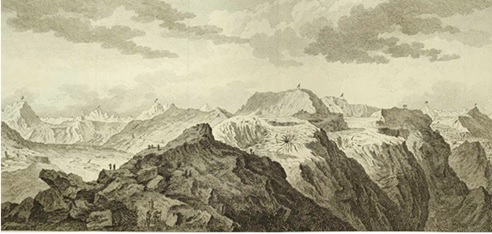 Le descrizioni delle vallate come incantati paradisi terrestri si moltiplicano, e conoscono una grande diffusione qualche decennio dopo, con Rousseau e con uno scienziato-alpinista, Horace-Bénédict de Saussure. Se le ricerche scientifiche portano ad una riscoperta della montagna come laboratorio in cui studiare le origini della Terra, sono tuttavia gli scrittori e i poeti (nonché i pittori) a “inventare” questo nuovo spazio dell’immaginario collettivo[7]. Gli alpinisti si incamminano verso le cime con il fardello di barometri e altimetri, ma i turisti che affluiscono sempre più numerosi sulle Alpi sono alla ricerca di luoghi incontaminati, di grandiosi scenari, di rustica autenticità, e hanno in tasca una copia di Die Alpen o della Nouvelle Héloïse, le guide perfette per una fruizione sentimentale dei nuovi spazi naturali.