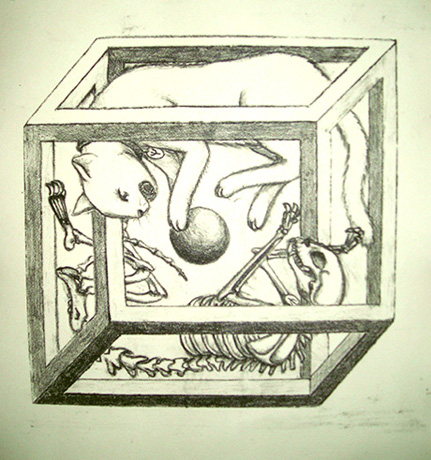 L’idea di cacciare un gatto dentro un simile marchingegno poteva venire solo al Vil Coyote o ad un Nobel austriaco. Capisco che si tratti di un paradosso, e che il buon Schrödinger voleva solo dimostrare come nello stesso istante una particella elementare possa trovarsi in posizioni diverse …