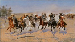 Russell, assieme a Remington, è il West. Lo hanno inventato loro, o comunque lo hanno fatto conoscere in tutto il mondo, ricamando su una realtà che di spunti ne offriva a bizzeffe. Il resto lo ha fatto John Ford. Russel non ha semplicemente viaggiato nel West …
