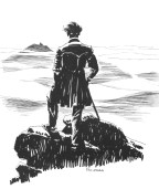 emana dai volti, prendo il coraggio a due mani: stacco dalla parete una riproduzione del Viandante sul mare di nebbia di Friedrich, prendo un foglio di cartoncino e un paio di pennarelli e li porgo a Callegari, chiedendogli di ricavare da quella immagine un bozzetto. Accetta immediatamente: sbarazza un angolino del tavolo e si mette a disegnare. Un’occhiata alla riproduzione e parte direttamente col pennarello sottile, viaggiando senza la minima esitazione. Impiega meno di cinque minuti, nel corso dei quali il caos e il vocio della sala si affievoliscono fino a trasformarsi in un silenzio quasi religioso, rotto solo ogni tanto da una risatina soddisfatta di Callegari. Quando mi riconsegna il foglio sono senza parole. Il risultato è quello che potete vedere qui di seguito.