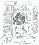 A testimoniarlo è ciò che coabita con i libri nei due principali santuari della mia biblioteca. Proprio un paio di giorni fa, seduto oziosamente sulla dondolo, consideravo le immagini che riempiono ogni porzione di parete sgombra dai libri (soffro dell’horror vacui). Nello studio gli spazi liberi da scaffalature sono davvero pochi, in pratica solo quelli sopra il caminetto e sopra la porta. Questi spazi sono coperti in prevalenza da immagini fotografiche, che a loro modo documentano sia il percorso culturale che quello esistenziale. A lato e sopra la porta si allineano le fotografie di voi ragazzi. Tu a un anno, Chiara forse a due, e poi io con Emiliano di cinque-sei anni, e ancora con Leonardo molto piccolo sulle spalle. Tra queste ultime due foto sono trascorsi quasi trent’anni. Completa la parete un disegno a carboncino riportato moltissimi anni fa da un viaggio, non ricordo dove. Raffigura un Don Chisciotte piuttosto stilizzato che si lancia contro i mulini a vento. Il disegno a dire il vero non è granché, ma col tempo mi ci sono affezionato: e comunque, come simbolo e riassunto di una vita, mi sembra azzeccato.