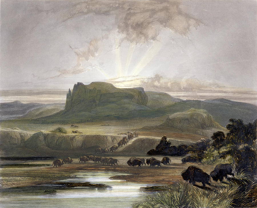 Diverso è anche lo sguardo che Bodmer ha per il paesaggio. A differenza dei pittori americani della scuola dell’Hudson, portati ad esaltare e qualche volta ad esasperare colori e dimensioni, a “drammatizzare” il paesaggio con rilievi scoscesi e cascate e fiumi impetuosi, Bodmer sembra colpito piuttosto dalla vastità, in certo qual modo anche monotona, dei panorami che ha di fronte. Gli orizzonti dei suoi dipinti non sono mai chiusi da imponenti catene montuose, quelle che ad esempio in Bierstadt o in Thomas Moran evidenziano la frontiera: lo sguardo scivola su corsi d’acqua che percorrono piatti e tranquilli immense vallate.