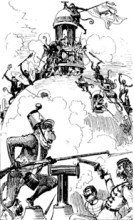 Ma torniamo invece all’originale. Ripensato oggi (dopo averlo velocemente scorso nella versione francese che si trova in rete – ma non è scaricabile), se proprio si vuol trovare un filo che non sia quello della pura fantasia sfrenata, credo che il romanzo giochi su tre filoni principali: il rapporto amore-odio con Verne, la carica utopistica, che almeno nella prima parte è rappresentata dai piani di riforma del mondo coltivati da Saturnino, l’attenzione alle tecnologie, quelle militari in primo luogo, e ai loro futuri possibili sviluppi. In mezzo ci stanno poi le riflessioni più bislacche, lunghe tirate contro la poligamia dei mormoni o contro l’Inghilterra, il razzismo delle scimmie nei confronti del primate privo di coda, il ruolo delle donne, nella società e anche nell’avventura, ecc … Cose che magari spezzano il ritmo – e ogni tanto davvero se ne sente il bisogno – ma fanno balenare qua e là idee controcorrente, intuizioni geniali, senza mai indurre il sospetto che siano state cacciate lì solo per tirarla in lungo, alla maniera degli inserti naturalistici salgariani (d’altro canto, essendo apparso il romanzo prima nella sua forma completa, con un enorme successo, ed essendo stato solo successivamente ripubblicato a fascicoli, non avrebbe avuto senso).