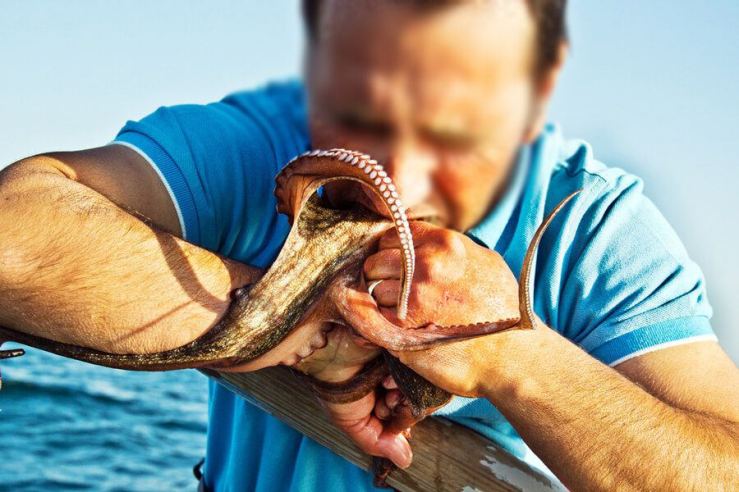 Infatti, soprattutto presso i pescatori, il polpo non gode di buona fama, essendo considerato un animale un po’ tonto, che invece di scappare, molto spesso si avvinghia al braccio o alla mano del pescatore, infliggendo segni della forza succhiante delle ventose o, molto più raramente, morsi del becco corneo, piuttosto dolorosi.